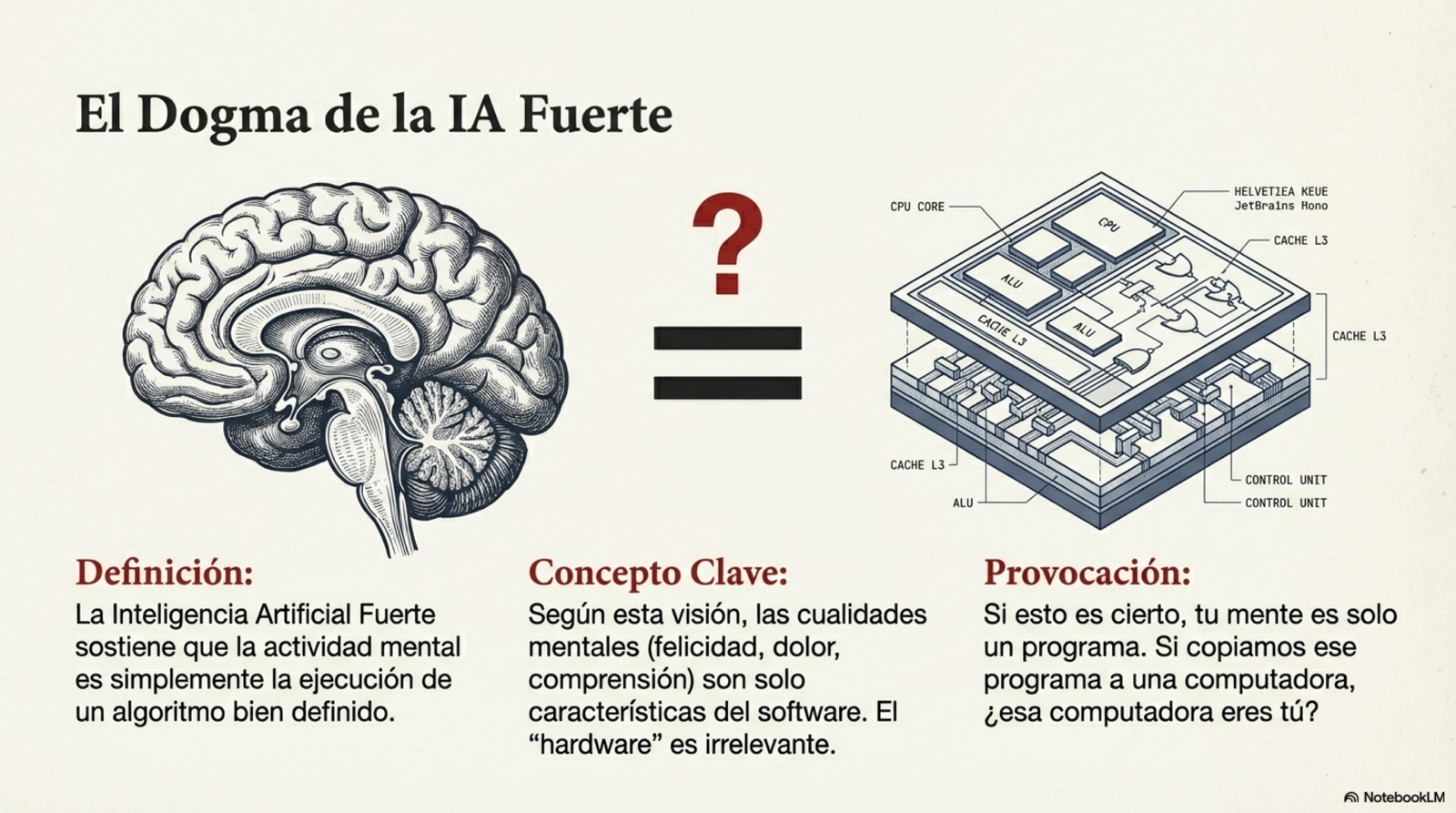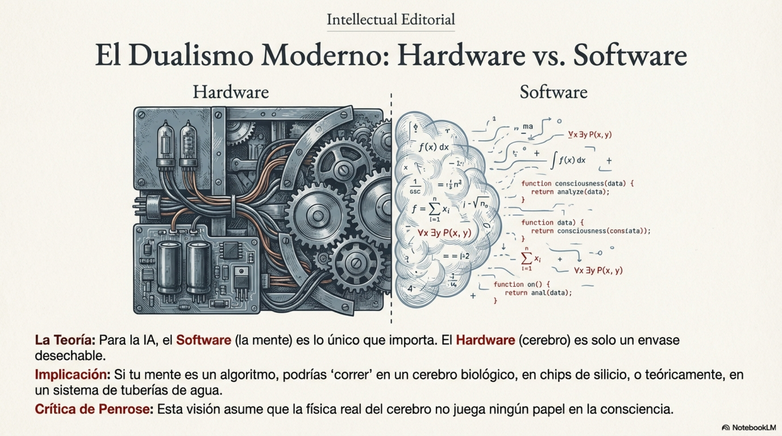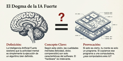 - El Problema de la IA Fuerte: El nuevo dualismo La "IA Fuerte" sostiene que la mente es solo un algoritmo y que el cerebro es simplemente un hardware biológico. Bajo esta premisa, la mente es un "software" incorpóreo que podría existir independientemente de la materia física, ya sea en silicio, válvulas de agua o engranajes. Penrose critica que esta visión se convierte irónicamente en un nuevo dualismo cartesiano. Si la mente es solo un programa, la estructura física del cerebro es irrelevante. Searle, citado por Penrose, lleva esta idea al absurdo señalando que, para algunos, "el cerebro es una computadora digital porque todo es una computadora digital". "La substancia mental de la IA fuerte es la estructura lógica de un algoritmo... La encarnación física concreta es algo totalmente irrelevante". Para ilustrar este despropósito, Penrose evoca el ejemplo del "Libro de Einstein" propuesto por Douglas Hofstadter. Si existiera un libro monstruoso que describiera cada operación del cerebro de Einstein, ¿podríamos decir que el libro es consciente? ¿Acaso Einstein "pensaría" mientras el libro permanece cerrado en un estante, o solo cuando alguien hojea sus páginas? La IA fuerte ignora que la consciencia podría depender de la estructura biológica y de fenómenos físicos concretos.