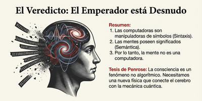 En el Gran Auditorio, la atmósfera está cargada de una expectación casi religiosa. El mundo asiste a la activación de "Ultronic", una supercomputadora con 10¹⁷ unidades lógicas, una cifra que supera el número total de neuronas de la población de un país entero. Mientras el presidente Polho sueña con delegar las tediosas decisiones de Estado a la máquina para retirarse a su campo de golf, un niño de trece años llamado Adam —criado casi exclusivamente por computadoras— observa desde la tercera fila. Al fondo, rodeado de guardias, su padre aguarda el castigo por haber intentado sabotear el nacimiento de esta "omnipresencia". Esta escena, que abre la obra de Roger Penrose, nos sitúa frente al espejismo central de nuestra era: la creencia de que nuestras mentes son simplemente "computadoras hechas de carne". Como el niño del relato de Hans Christian Andersen que se atreve a señalar que el emperador va desnudo, Penrose utiliza su vasta erudición en física y matemáticas para desafiar el dogma de la Inteligencia Artificial (IA) Fuerte, invitándonos a considerar que la consciencia no es un subproducto de la complejidad algorítmica, sino un fenómeno vinculado a las leyes más profundas del universo.