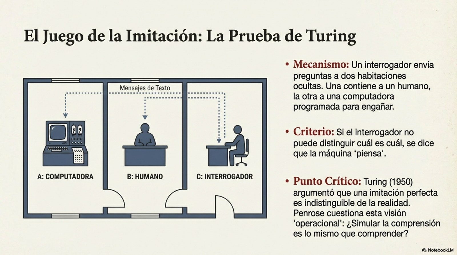 - El Test de Turing: Cuando la imitación no es suficiente El concepto operacional para medir la inteligencia surge con Alan Turing en 1950. La prueba es un juego de engaño: un interrogador debe distinguir entre un ser humano y una computadora a través de preguntas transmitidas por teclado. Para ganar, la máquina debe "mentir" y simular con éxito la psicología humana. Penrose acepta este test como un criterio útil desde un punto de vista conductista, pero señala sus carencias fundamentales. La imitación de una respuesta, por más perfecta que sea, no garantiza que exista una presencia consciente detrás de ella. De hecho, para que una máquina pase la prueba, los programadores deben diseñarla para parecer "más estúpida" en tareas matemáticas donde es naturalmente superior (como multiplicar números de treinta cifras en segundos), revelando que el éxito del test reside en la habilidad del engaño y no en la verdadera comprensión. "A la computadora se le pide que dé respuestas de tipo humano a cualquier pregunta... y estamos afirmando que realmente piensa siempre que responda de una manera indistinguible a la de un ser humano".
