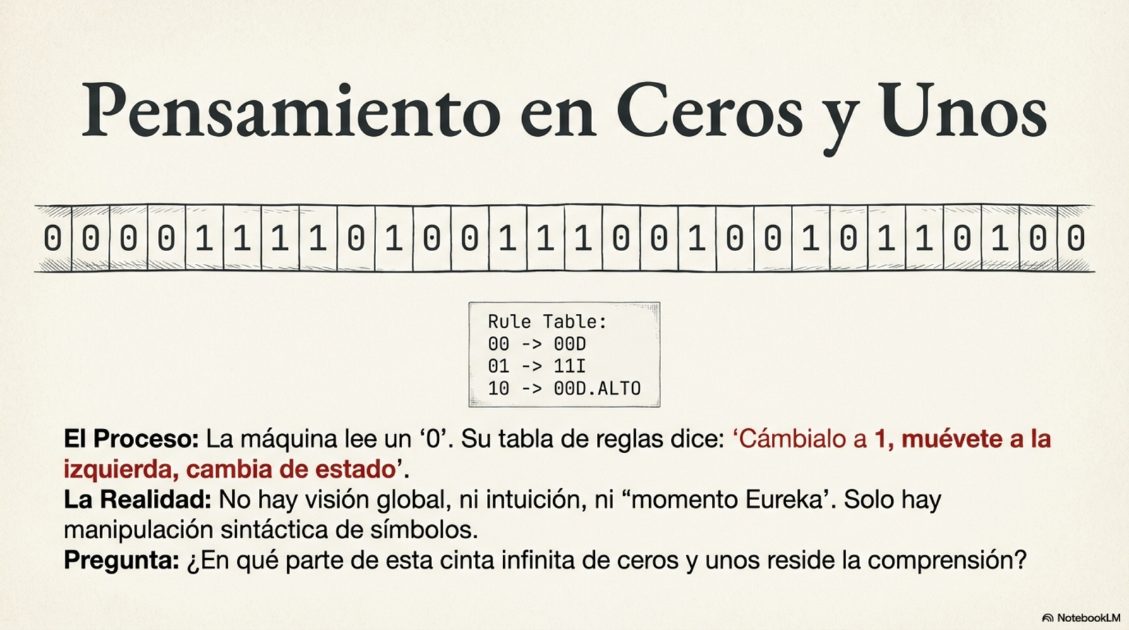 Para desmantelar la idea de que ejecutar un programa equivale a pensar, Penrose analiza el experimento mental de John Searle: La Habitación China. Imagine a una persona que no sabe una palabra de chino encerrada en una habitación con un libro de instrucciones en inglés. Por una ranura recibe símbolos en chino (preguntas) y, siguiendo las reglas del libro (el algoritmo), entrega otros símbolos (respuestas).