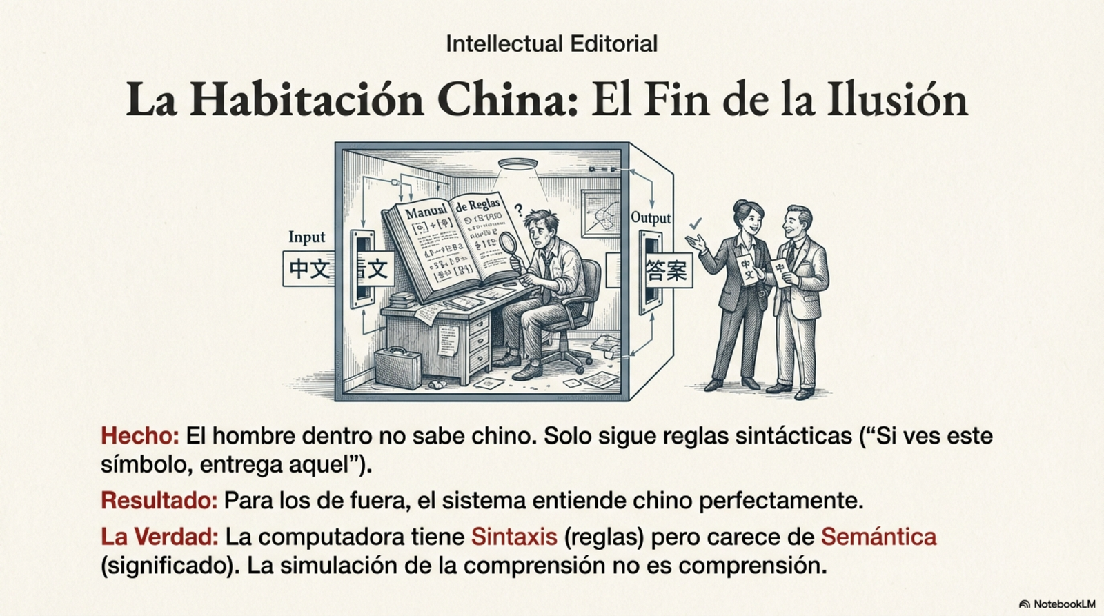 Para el observador externo, la habitación "entiende" chino. Pero el ocupante solo está manipulando símbolos sin comprender su significado. Esta es la distinción crítica entre: