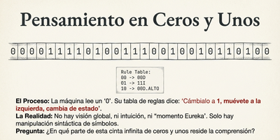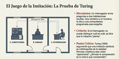 - El Test de Turing: Cuando la imitación no es suficiente El concepto operacional para medir la inteligencia surge con Alan Turing en 1950. La prueba es un juego de engaño: un interrogador debe distinguir entre un ser humano y una computadora a través de preguntas transmitidas por teclado. Para ganar, la máquina debe "mentir" y simular con éxito la psicología humana. Penrose acepta este test como un criterio útil desde un punto de vista conductista, pero señala sus carencias fundamentales. La imitación de una respuesta, por más perfecta que sea, no garantiza que exista una presencia consciente detrás de ella. De hecho, para que una máquina pase la prueba, los programadores deben diseñarla para parecer "más estúpida" en tareas matemáticas donde es naturalmente superior (como multiplicar números de treinta cifras en segundos), revelando que el éxito del test reside en la habilidad del engaño y no en la verdadera comprensión. "A la computadora se le pide que dé respuestas de tipo humano a cualquier pregunta... y estamos afirmando que realmente piensa siempre que responda de una manera indistinguible a la de un ser humano".