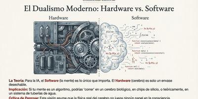 - El Problema de la IA Fuerte: El nuevo dualismo La "IA Fuerte" sostiene que la mente es solo un algoritmo y que el cerebro es simplemente un hardware biológico. Bajo esta premisa, la mente es un "software" incorpóreo que podría existir independientemente de la materia física, ya sea en silicio, válvulas de agua o engranajes. Penrose critica que esta visión se convierte irónicamente en un nuevo dualismo cartesiano. Si la mente es solo un programa, la estructura física del cerebro es irrelevante. Searle, citado por Penrose, lleva esta idea al absurdo señalando que, para algunos, "el cerebro es una computadora digital porque todo es una computadora digital". "La substancia mental de la IA fuerte es la estructura lógica de un algoritmo... La encarnación física concreta es algo totalmente irrelevante". Para ilustrar este despropósito, Penrose evoca el ejemplo del "Libro de Einstein" propuesto por Douglas Hofstadter. Si existiera un libro monstruoso que describiera cada operación del cerebro de Einstein, ¿podríamos decir que el libro es consciente? ¿Acaso Einstein "pensaría" mientras el libro permanece cerrado en un estante, o solo cuando alguien hojea sus páginas? La IA fuerte ignora que la consciencia podría depender de la estructura biológica y de fenómenos físicos concretos.