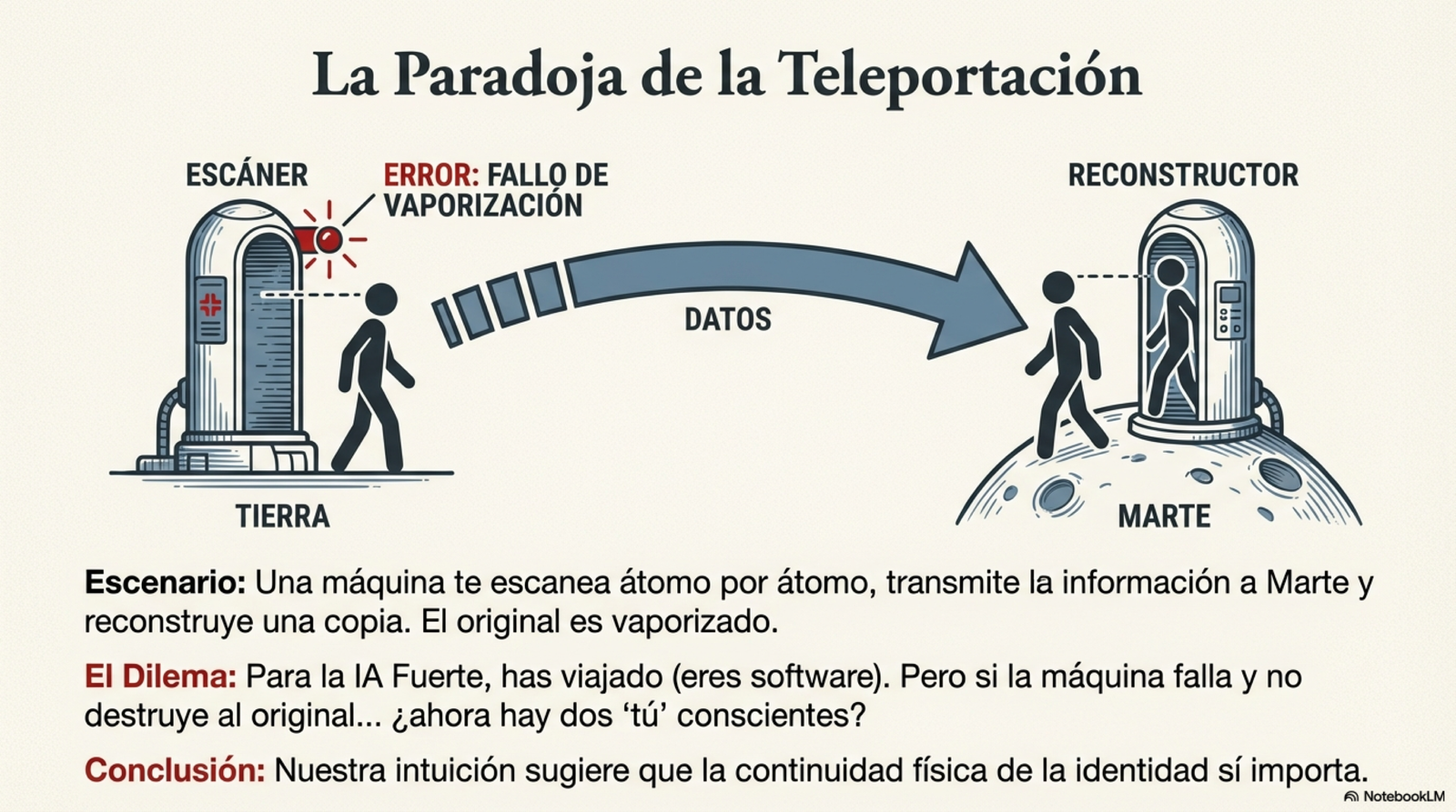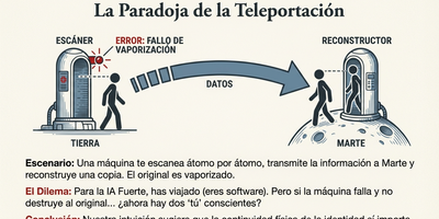 - La Paradoja de la Teletransportación: ¿Eres información o materia? ¿Qué pasaría si una máquina escaneara cada átomo de tu cuerpo y enviara esa información a Marte para reconstruirte allí? Para la IA fuerte, el resultado sería "tú", pues eres considerado una pauta de información. Pero Penrose plantea una pregunta inquietante: si la máquina reconstruye tu copia en Marte pero, por un error técnico, no destruye el original en la Tierra, ¿cuál de los dos eres tú? Si te dijeran: "Hubo un problema, el usted real ya llegó a salvo a Marte, así que procederemos a eliminar esta copia redundante que queda aquí; será totalmente indoloro", ¿lo aceptarías? Esta paradoja sugiere que la identidad y la consciencia no son solo un "software" que se pueda copiar y pegar. Existe una continuidad de la consciencia vinculada a la materia física que los algoritmos de información pura no logran capturar.
