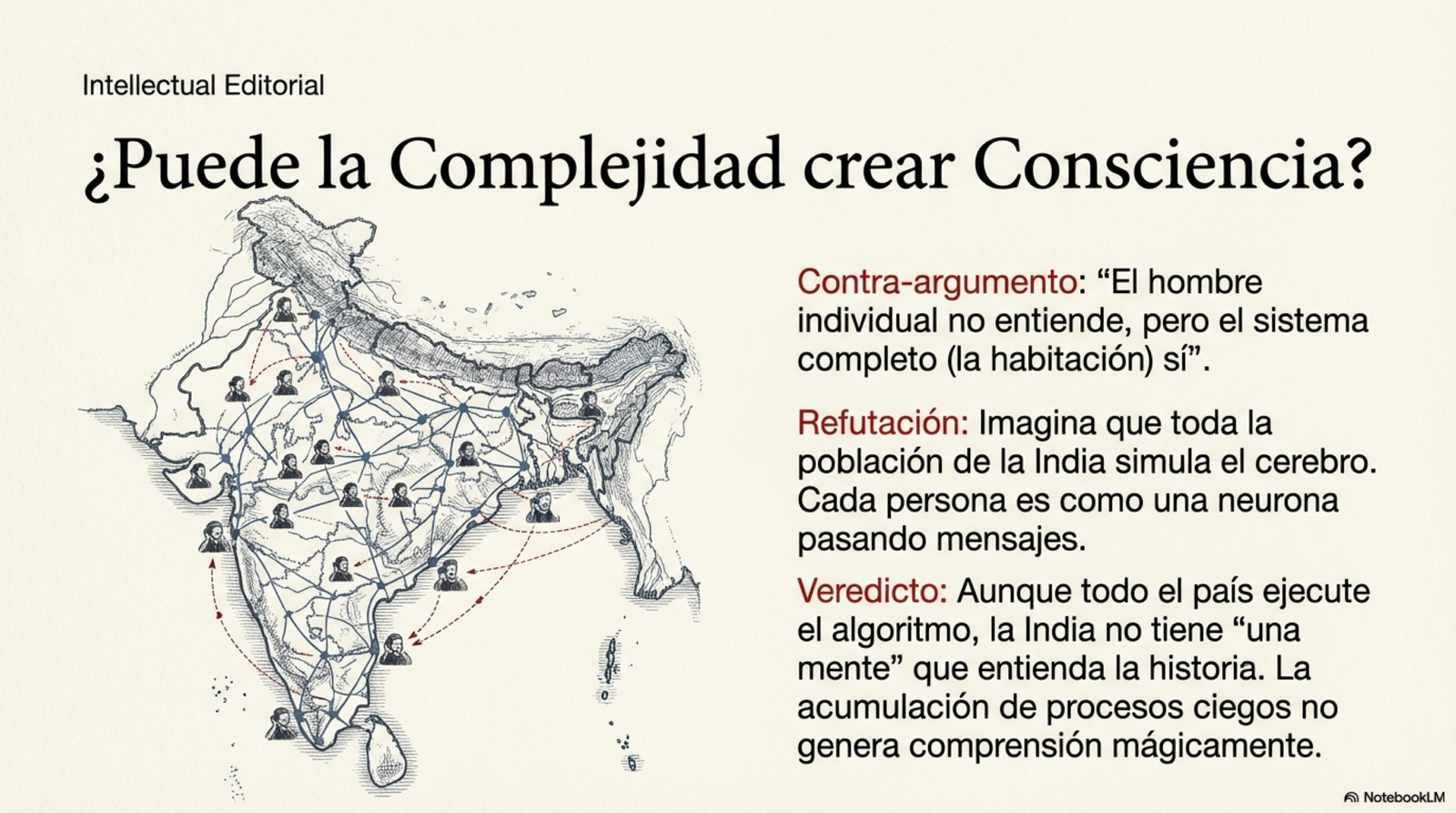 Para desmantelar la idea de que ejecutar un programa equivale a pensar, Penrose analiza el experimento mental de John Searle: La Habitación China. Imagine a una persona que no sabe una palabra de chino encerrada en una habitación con un libro de instrucciones en inglés. Por una ranura recibe símbolos en chino (preguntas) y, siguiendo las reglas del libro (el algoritmo), entrega otros símbolos (respuestas).